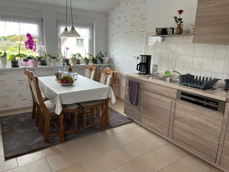 Die voll ausgestattete, moderne Wohnküche mit großzügigem Essbereich lädt zum gemeinsamen Kochen und Verweilen ein. Eine Waschmaschine steht Ihnen zur freien Verfügung; ein Wäschetrockner kann gegen eine geringe Gebühr genutzt werden. Für Langzeitaufenthalte in unserer komfortablen Ferienwohnung bieten wir nach Absprache auch Zwischenreinigungen an. #Langzeitaufenthalte #FerienwohnungMitKüche